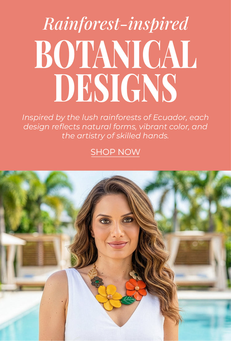 Discover handcrafted jewelry born from the heart of Ecuador's rainforest. We proudly uphold Fair Trade principles, crafting each unique piece from 100% organic, sustainably harvested materials using traditional artisan techniques.