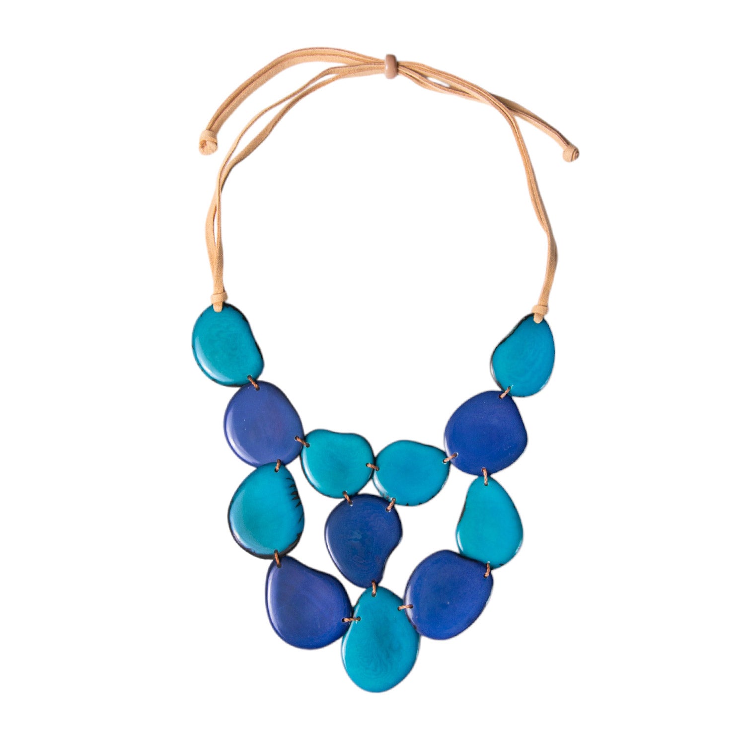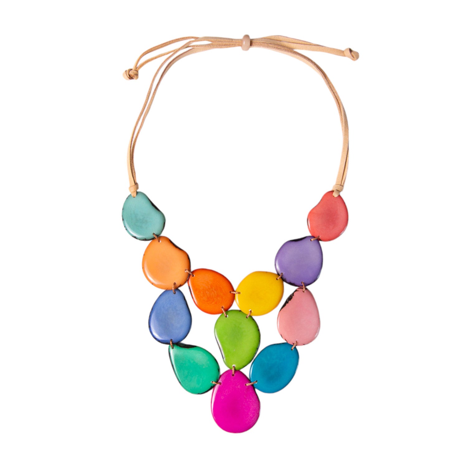 Our beloved Waterfall Necklace is back by popular demand! Named for the way its cascading tagua slices gracefully fall down the neck, this vibrant, adjustable necklace features tagua slices linked with waxed cotton cord on a faux leather cord.