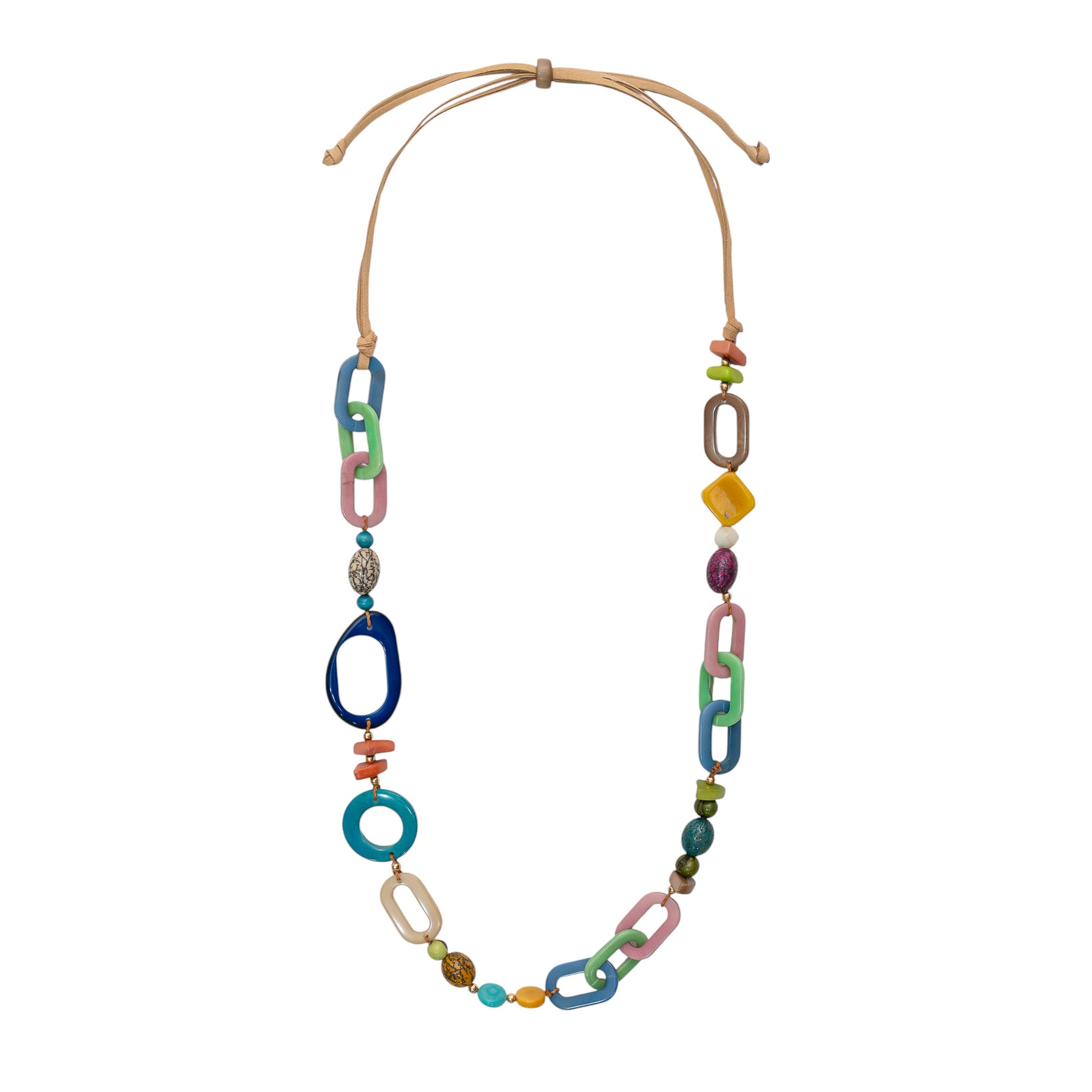 The Elaine Necklace features a playful mix of polished tagua links, geometric beads, and organic shapes arranged in a long, colorful design. Lightweight and adjustable, it showcases artisan craftsmanship with a fun, modern twist perfect for adding personality and vibrant style to any look.