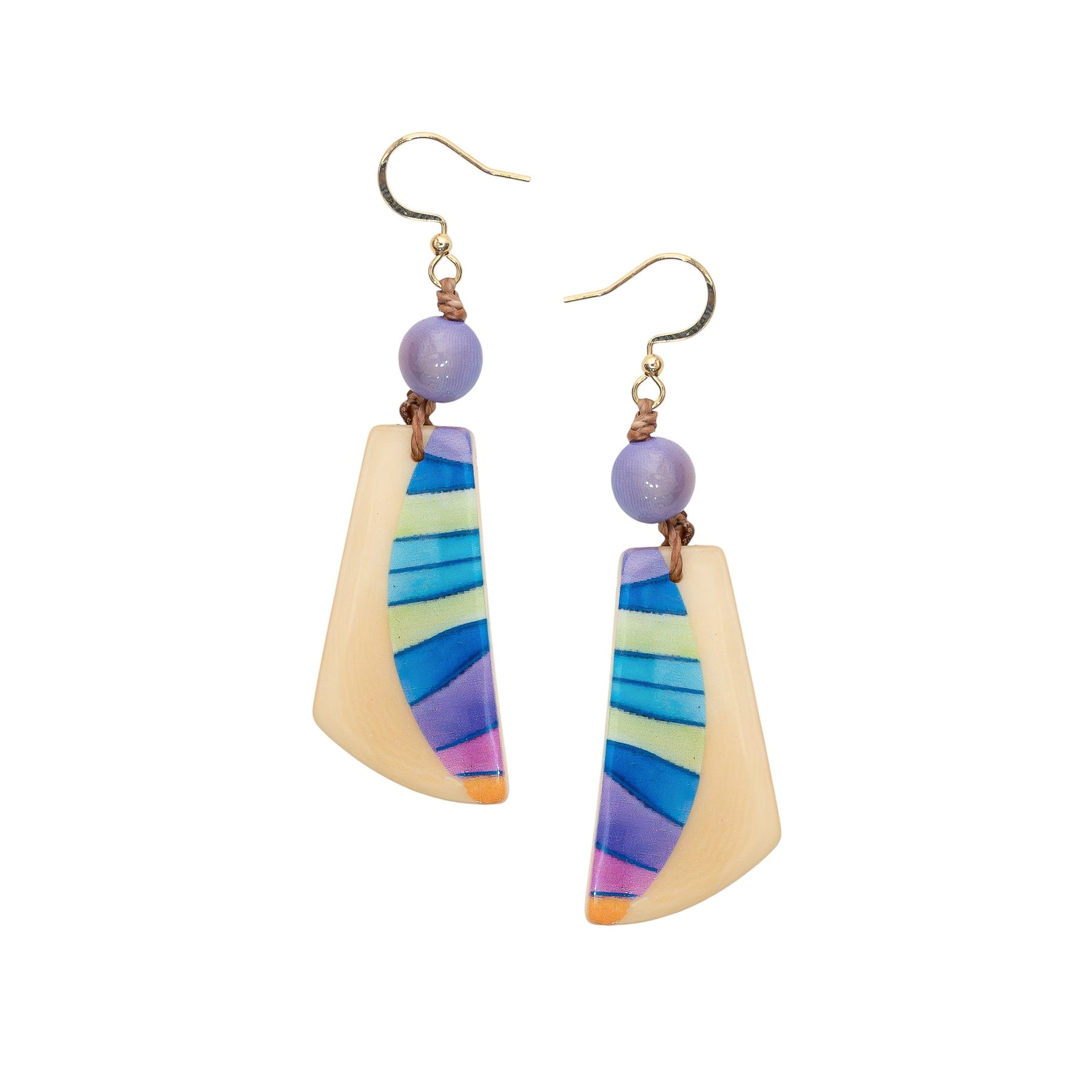These 2.5-inch Judith Earrings feature captivating tagua dangles adorned with a brilliant, vibrant pattern. Expertly crafted, they combine natural materials with striking design to add a unique, colorful accent to any outfit. Perfect for those seeking eco-friendly elegance with a bold artistic touch.