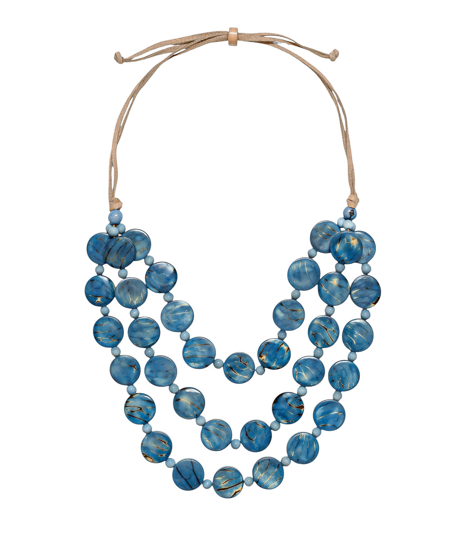 The Nicky Necklace features beautifully polished tagua discs arranged in three cascading strands, creating a bold yet lightweight statement. Each piece is handcrafted by Ecuadorian artisans and finished on a durable, adjustable waxed cotton cord. Its vibrant colors and organic textures make it a versatile accessory that transitions effortlessly from everyday outfits to elevated looks.