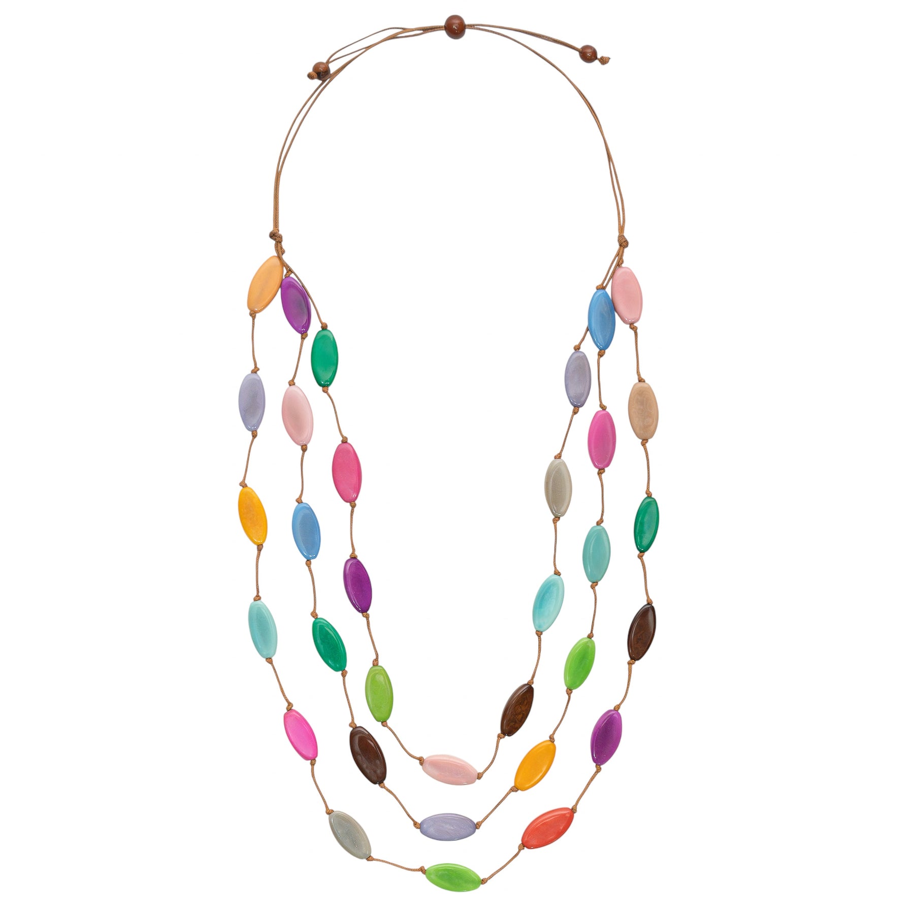 The Olympia Necklace radiates bold, natural elegance through its sculpted tagua pendants, each shaped to evoke organic movement and artisanal charm. Suspended from a vibrant handcrafted chain, this piece is designed to stand alone—an unmistakable statement necklace that celebrates sustainable artistry and vivid color.