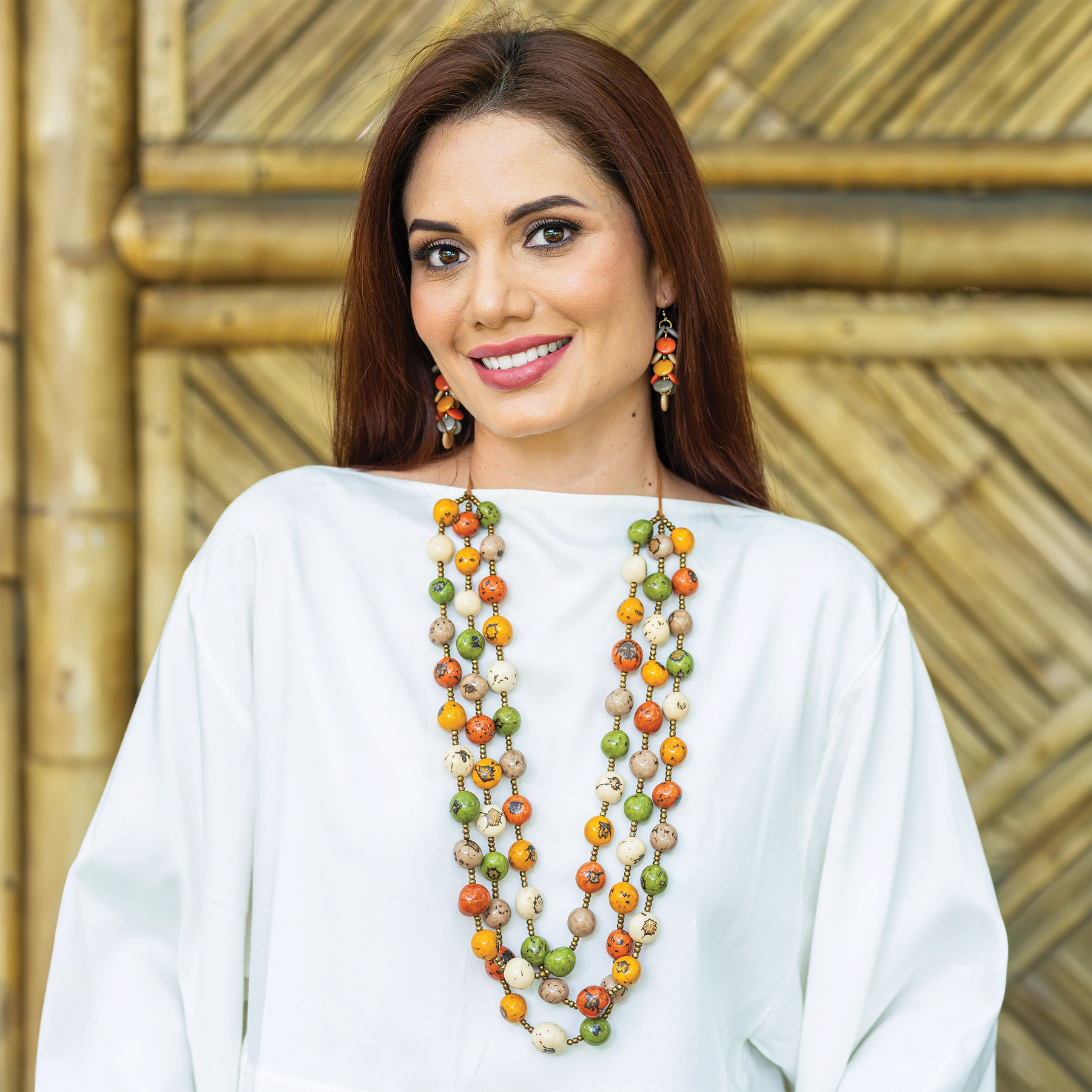 The Soleil Necklace is a bold, expressive statement piece measuring 28 to 40 inches in length. Crafted with layered vibrant bombona seeds, it offers a striking combination of natural texture and vivid color. This necklace enhances any outfit with its dynamic presence, showcasing expert craftsmanship and sustainable materials for a unique, eye-catching accessory.