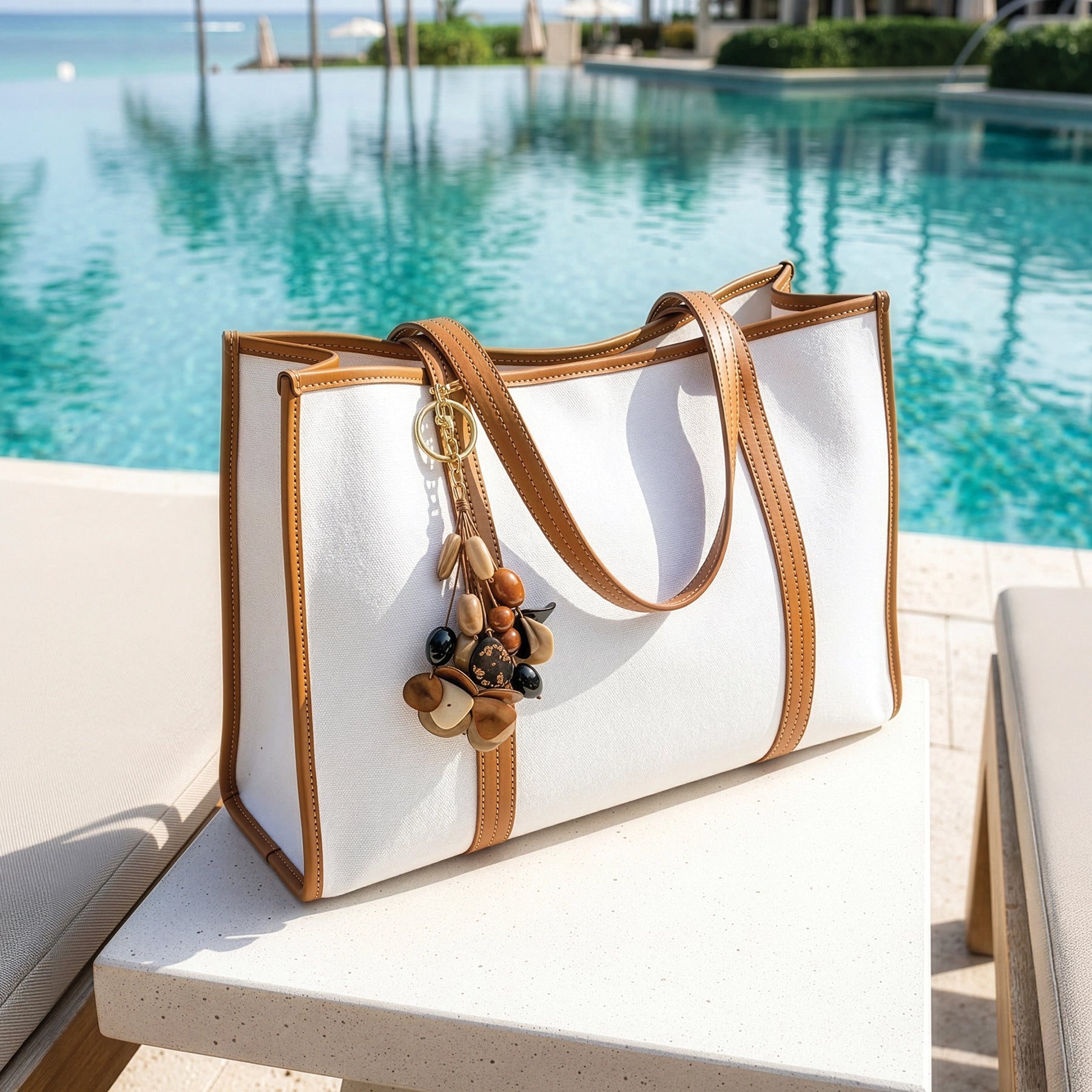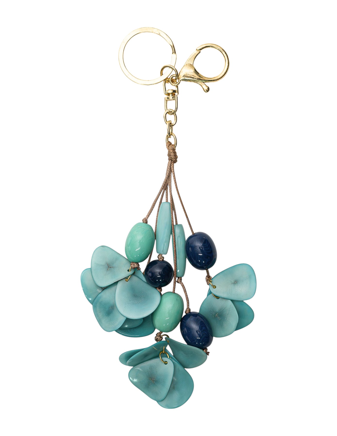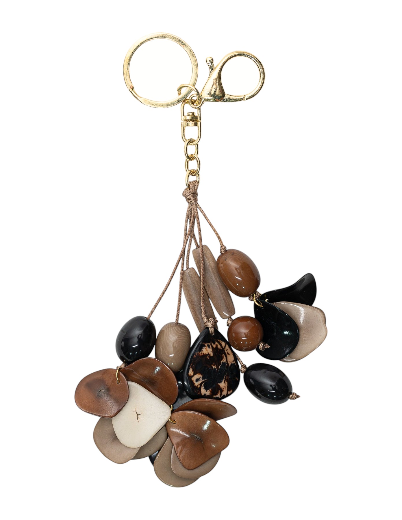The Tagua Blossom Bag Charm features a charming cluster of hand-carved tagua pieces shaped like delicate blossoms, accented with smooth beads that create soft movement. Lightweight and full of natural color, this bag charm adds a playful yet elegant accent to handbags, totes, or keys while showcasing artisan craftsmanship from Ecuador.