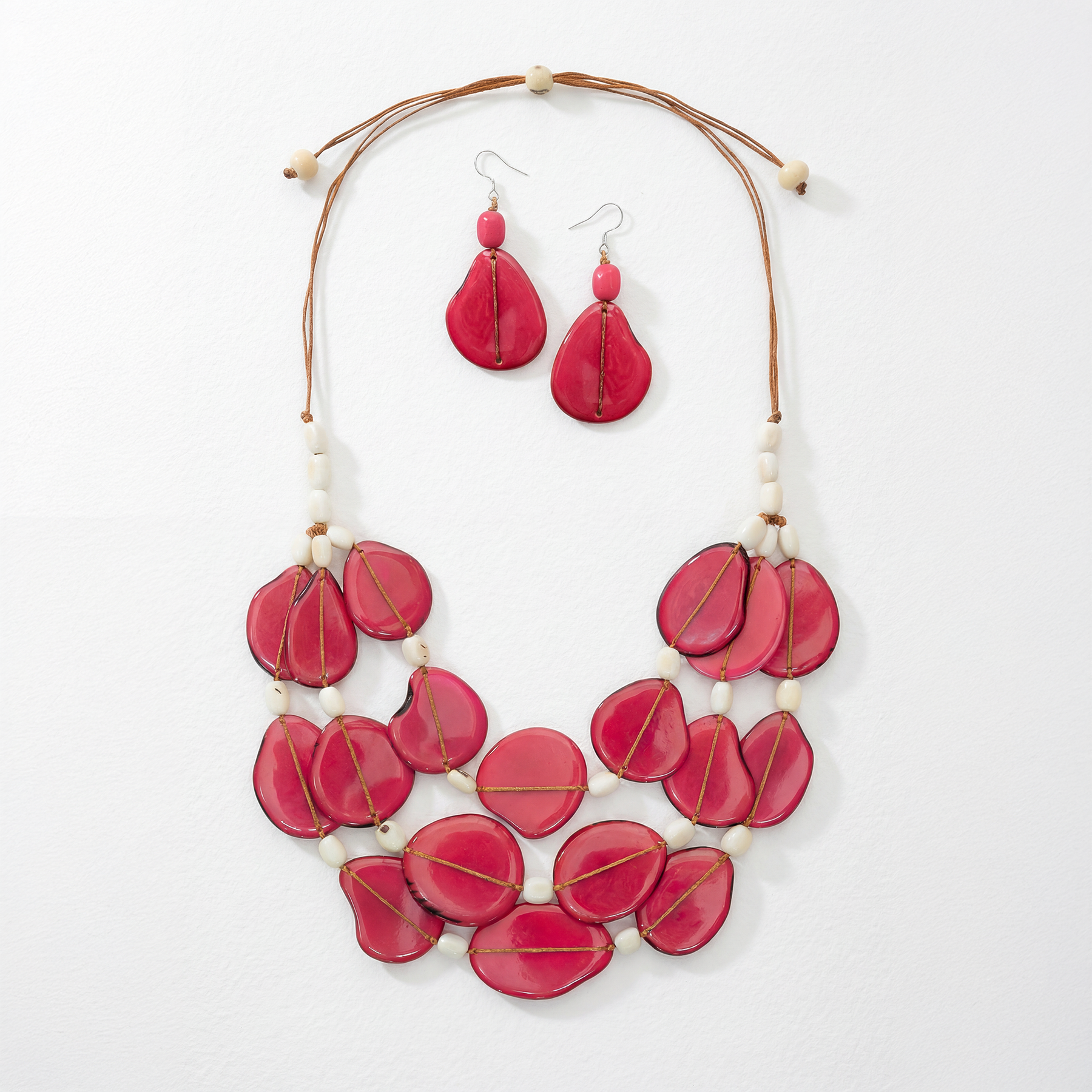 This striking collection features rich raspberry-red tagua slices, hand-crafted by skilled artisans and paired with soft ivory accents for beautiful contrast. The organic shapes and layered design create a flattering silhouette that transitions effortlessly from daytime chic to evening elegance.