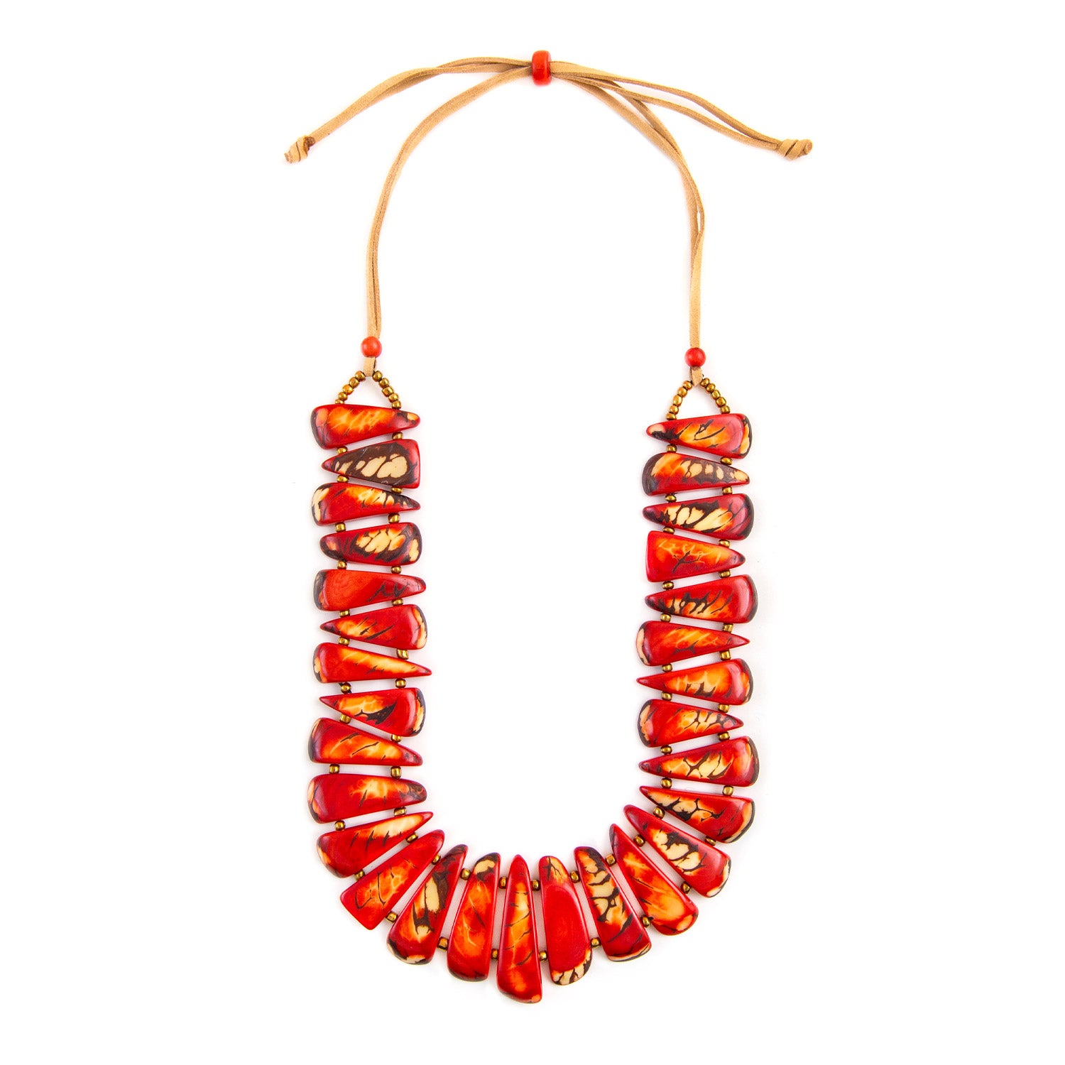 Unleash your inner strength and courage with the Ursula Necklace—a tribal-inspired, single-strand adjustable necklace featuring alternating colorful triangular-shaped tagua pieces that showcase the natural grain of the tagua nut. Like its namesake, Ursula, known for its associations with strength, courage, and protection, this necklace offers retailers a captivating piece that celebrates individuality and empowers wearers to embrace their bold, fearless spirit.