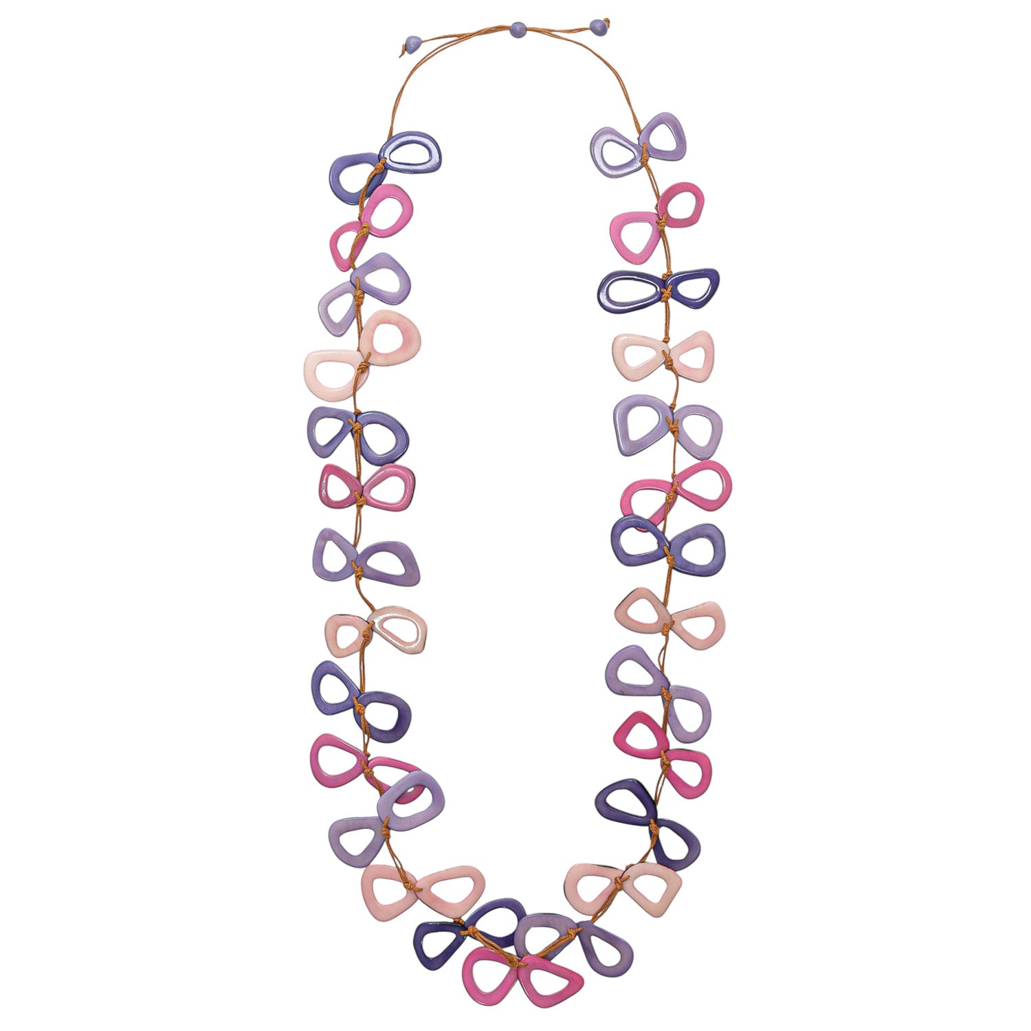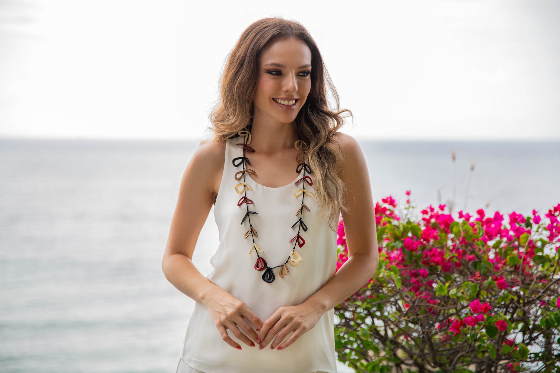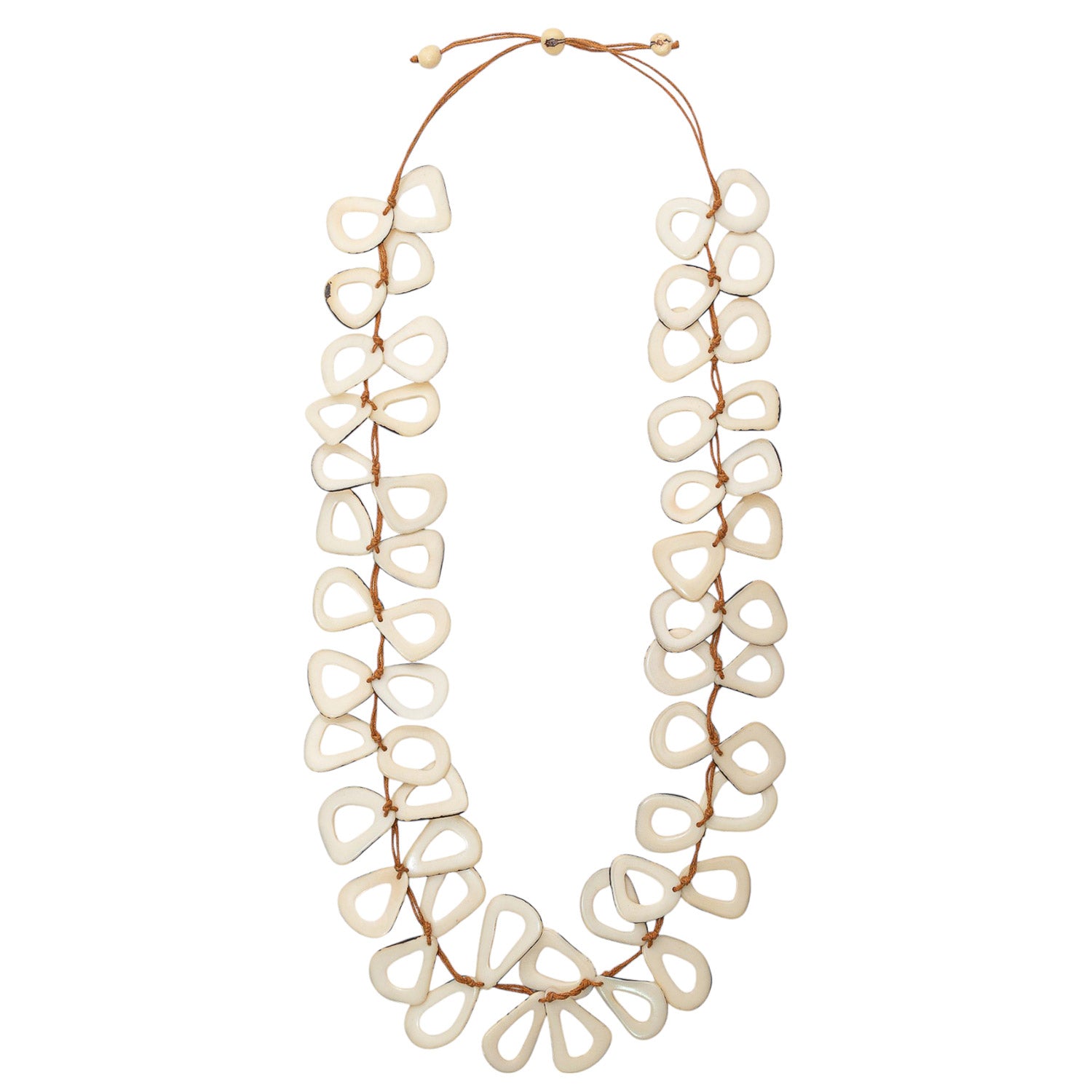 The Tullia Necklace features an adjustable length from 32" to 40", showcasing a masterful arrangement of vibrant tagua shapes. Each piece is meticulously handcrafted, highlighting the natural beauty and rich colors of tagua nuts. This necklace offers both versatility and a striking aesthetic, making it an expert choice for those seeking unique, sustainable jewelry with a dynamic presence.